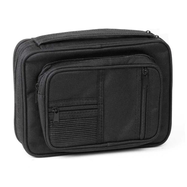 An organizer’s dream! Polyester canvas Bible cover has a multitude of pockets, including a special zipped section in back that comes with a 6″” x 9″” spiral bound lined notepad, plus four highlighters and a pen. All have their own storage pockets. On front are 3 different size zippered pockets; the smallest is mesh. Inside the largest are 3 card size pockets and a hook for a keyring, etc. In main compartment are an elastic pen loop and a ribbon bookmark. Available in two colors and two sizes. Large has inner dimensions of 9 3/4 x 6 3/4 x 1 3/4 inches, and X-Large is 10 1/4 x 7 1/4 x 2 inches.