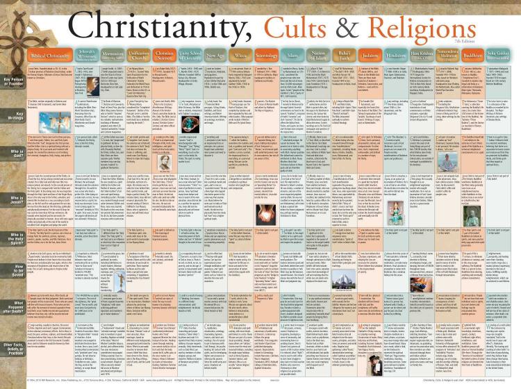 Best-seller Christianity, Cults & Religions wall chart compares the beliefs of 18 world religions and cults at a glance! Know what each group believes about God, Jesus, Salvation, and more. Researched by some of the top scholars in the field, the chart features more groups than any other side-by-side chart and contains the most up-to-date information. Includes information regarding: