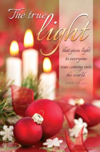 Bring true light to their Christmas. Featuring traditional colors, candles, and ornaments paired with the words of John 1:9, this bulletin is perfect for Christmas or the season of Advent. With coordinating letterhead, bookmarks, and offering envelopes buy individually or as a set.