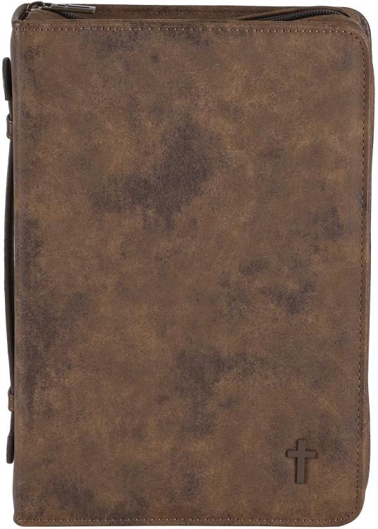 Polyurethane Hard-Shell Suede-Look Brown Bible Cover With Cross Plate. Features A Cross Zipper Pull, Lay-Flat Construction, Non-Rusting Self-Repairing Zipper And Nylon Reinforced Stitching. Carrying Handle On Spine. Approximate Extra-Large-Size Dimensions 10-1/4 X 2 X 7-1/4.