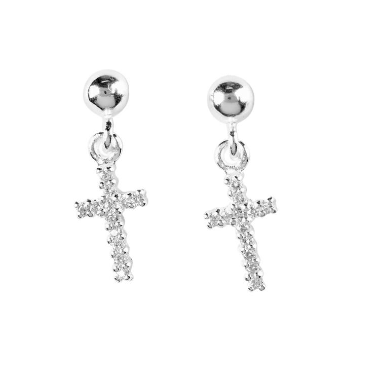 Dainty crosses, sparkling with cubic zirconia stones, dangle from round studs on these silver plated earrings. Posts are sterling silver. Length of cross is 3/8″”. Earring set comes in a deluxe black gift box..