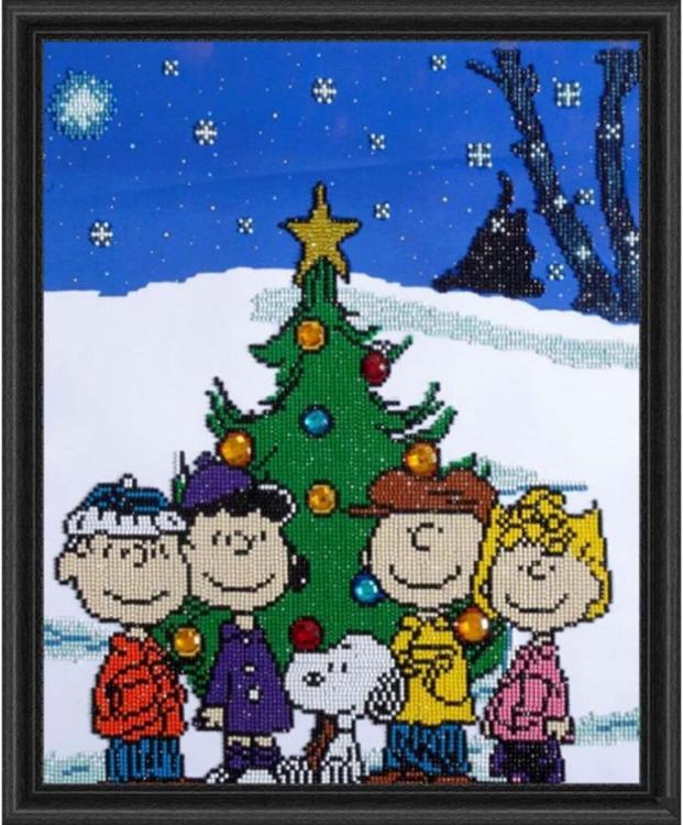 This diamond painting image features Charlie Brown and his pals in a sparkling Christmas celebration! Favorite members of the Peanuts Gang including Charlie Brown, Sally, Lucy, Linus, and Snoopy are shown gathered around a decorated Christmas tree that sparkles and shines on a winter day.