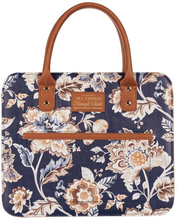 The I Can Do All Things Toffee-brown and Navy Purse-style Bible Cover looks like a designer purse but is designed to protect your Bible from the war and tear of daily use.
