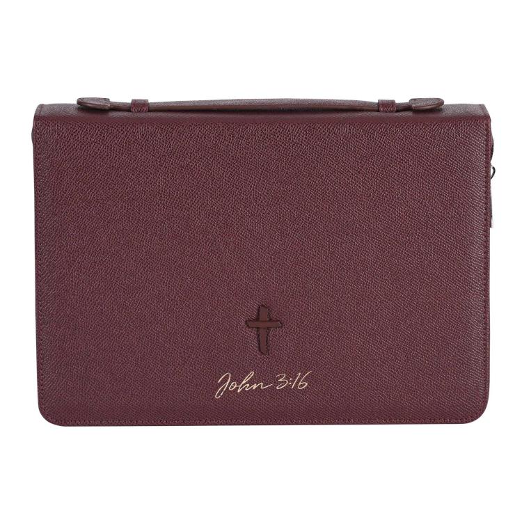 Hard Shell Style Polyurethane Bible Case. Solid Color Burgundy Handbag Material With Matching Color Cross Plate And Debossed John 3:16 Reference. Inside Is A Bookmark & Elastic Pen Loop With Cut Thru Cross Zipper Pull; Side Handle, Non-Rusting Self-Repairing Zipper, Nylon Reinforced Stitching, Xx-Large Holds A Bible Or Book Up To 10-3/4 X 8-1/4 X 2.