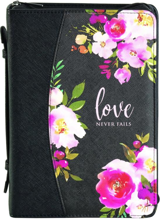 Bible cover with black-colored body and pink/floral accents on the front. Features inspiring text: Love never fails. Size large.