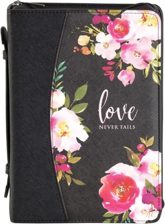 Bible cover with black-colored body and pink/floral accents on the front. Features inspiring text: Love never fails. Size XL.