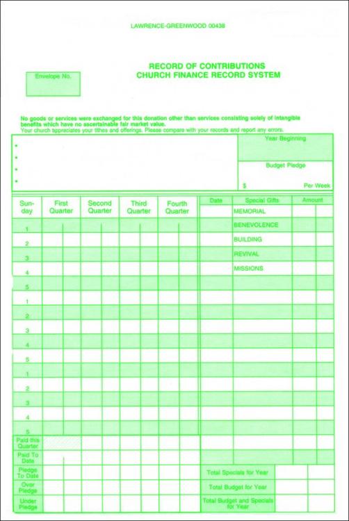 Five-part forms, carbon paper supplied to record contributions from individual members, provide separate yearly copies for each member’s tax records, and send quarterly copies – all without additional bookkeeping or transferring to other forms.