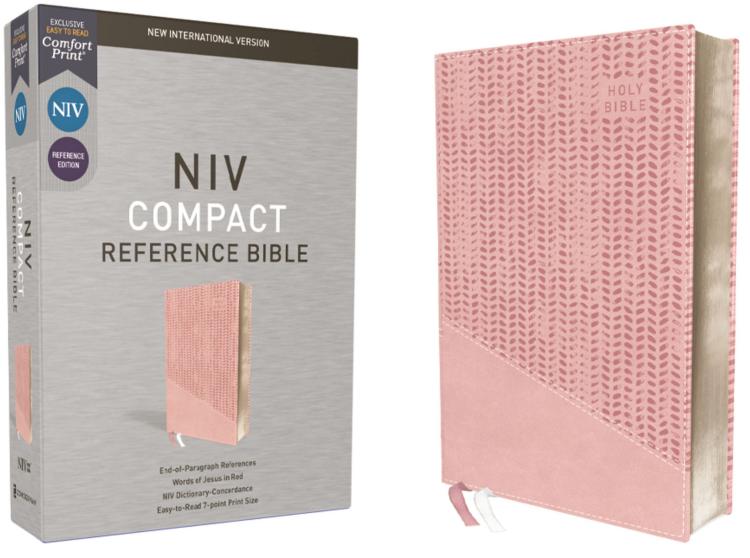 The Bible for people on the go, in the perfect sizeThe NIV Reference Bible, Compact has the features of a reference Bible in a handy, take-anywhere size. Ideal for anyone who seeks both portability and study power, this Bible features end-of-paragraph references, full-color maps, and is easy to read with Zondervan’s exclusive NIV Comfort Print typeface.Expertly designed specifically to be used for the New International Version (NIV) text, Comfort Print offers an easier reading experience that complements the most widely read modern-English Bible translation. Features:Complete text of the accurate, readable, and clear New International Version (NIV)Convenient, portable sizeDouble-column formatPresentation pageTwo satin ribbon markersWords of Jesus in redNIV dictionary/concordanceEight pages of full-color mapsExclusive Zondervan NIV Comfort Print typeface7-point print size