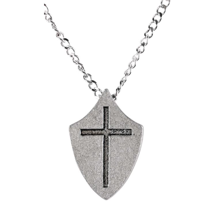 1 1/4 inches Shield Cross Necklace on 24 inch Stainless Steel chain. Comes in black fabric covered deluxe gift box.
