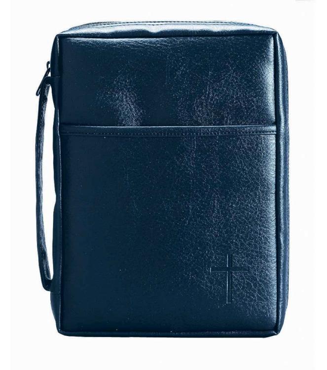 Vinyl cover has soft leather look and feel. Front has cross imprint accent. Features nylon reinforced stitching, lay flat design, and non-rusting, self-repairing zipper. In addition there is a convenient pocket on front and carrying handle on side. Blue Soft Vinyl w/ Cross Large size holds a Bible or book up to about 7 1/8″” x 10 1/4″” x 2″”.