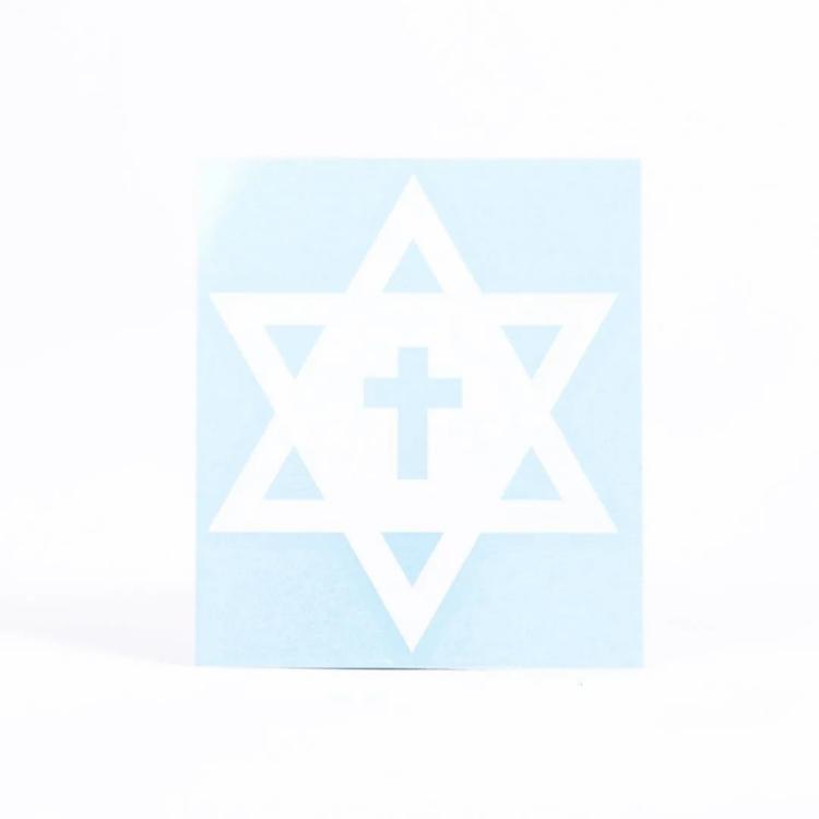 This durable white vinyl sticker features a beautiful dye-cut design of the Star of David with a Cross int he center. Measuring 3 x 3.5 inches, it s the perfect size to use for a variety of purposes.