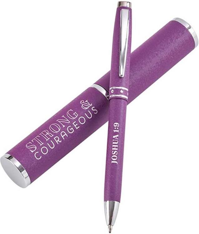 A sweet gift for your niece~ daughter~ or mother-in-law~ the Strong & Courageous Purple Pen will make her smile each time she uses the retractable pen as she’s writing her to-do list~ jotting down notes at work~ or preparing a menu for a dinner party. The theme from the Joshua 1:9 verse will empower her to remember the Lord’s command to be a strong and courageous person~ and set an example for others in her life.