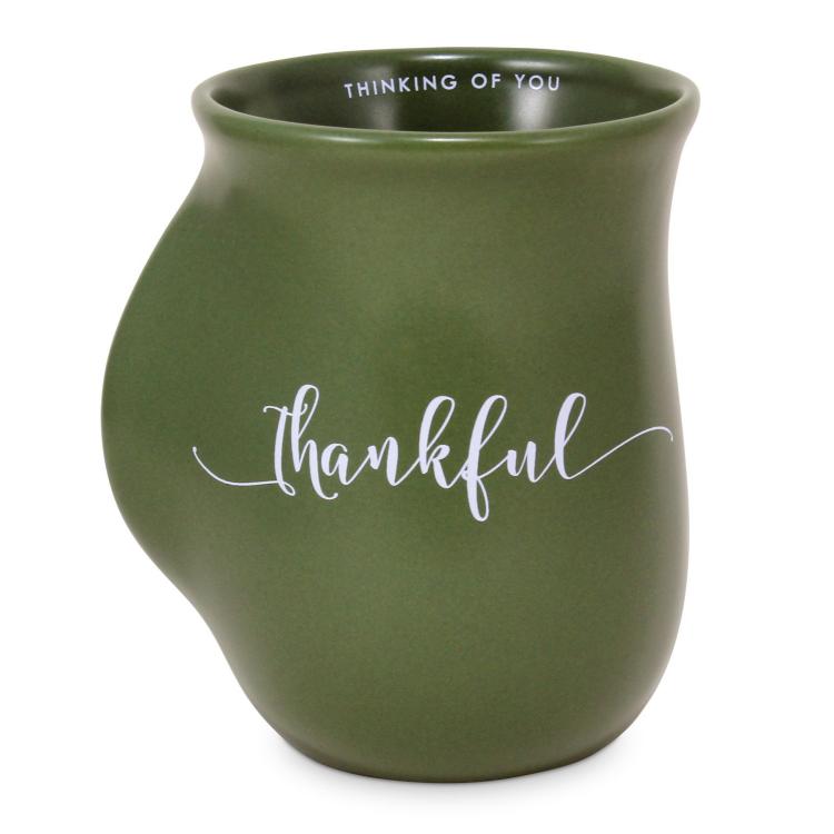 Unique style handwarmer mug is designed to warm your hand while you enjoy your hot beverage. Orange ceramic mug featuring simple white script word with Scripture verse on the back. 14 ounce capacity; microwave and dishwasher safe; boxed.