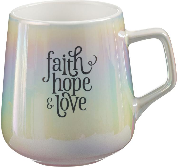 The Faith Hope and Love Iridescent Ceramic Mug‘s whimsical design complements any occasion and table. Its shimmery design inspires happy thoughts and happy times~ and its encouraging message lifts the spirit and infuses the day with positivity.